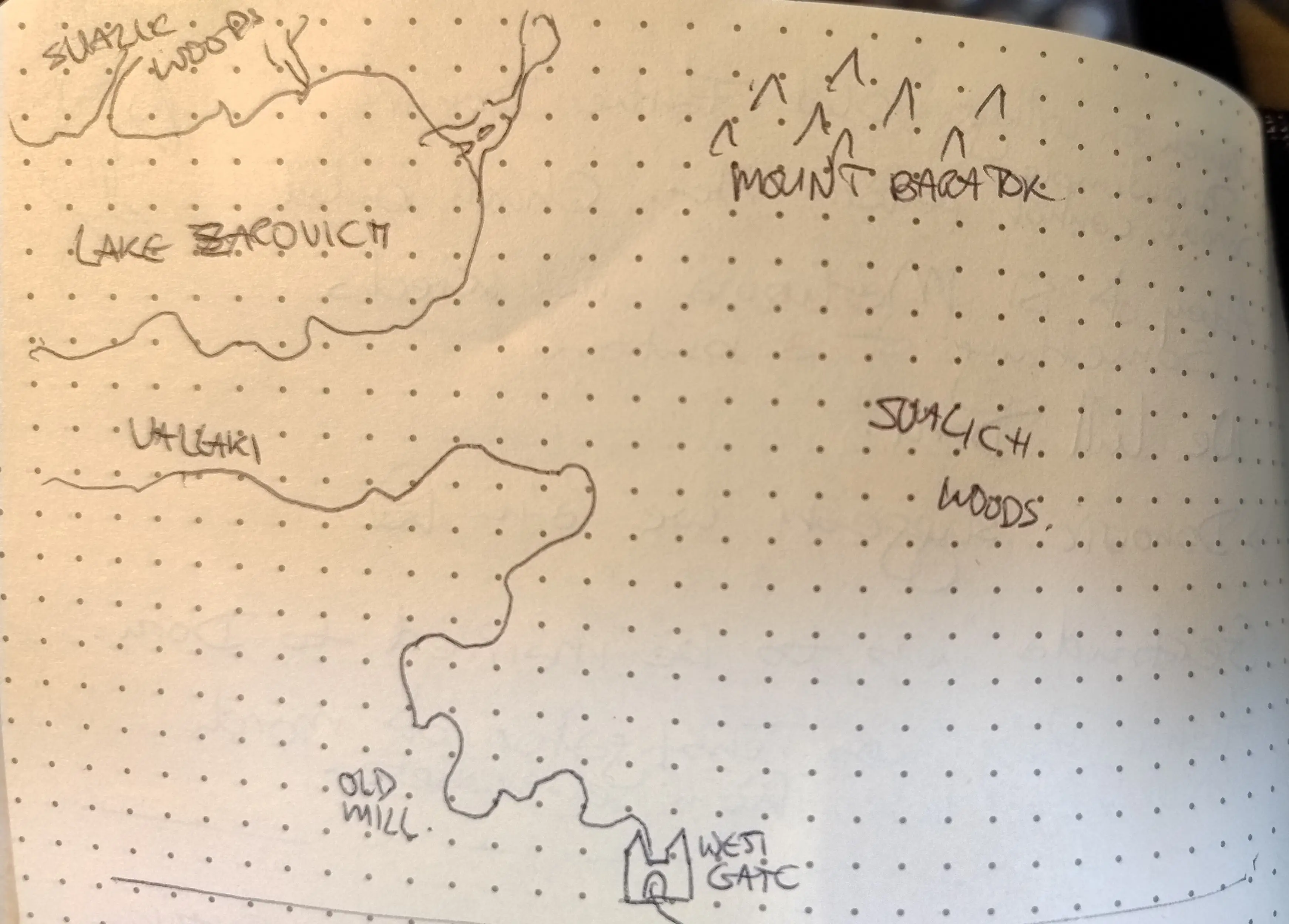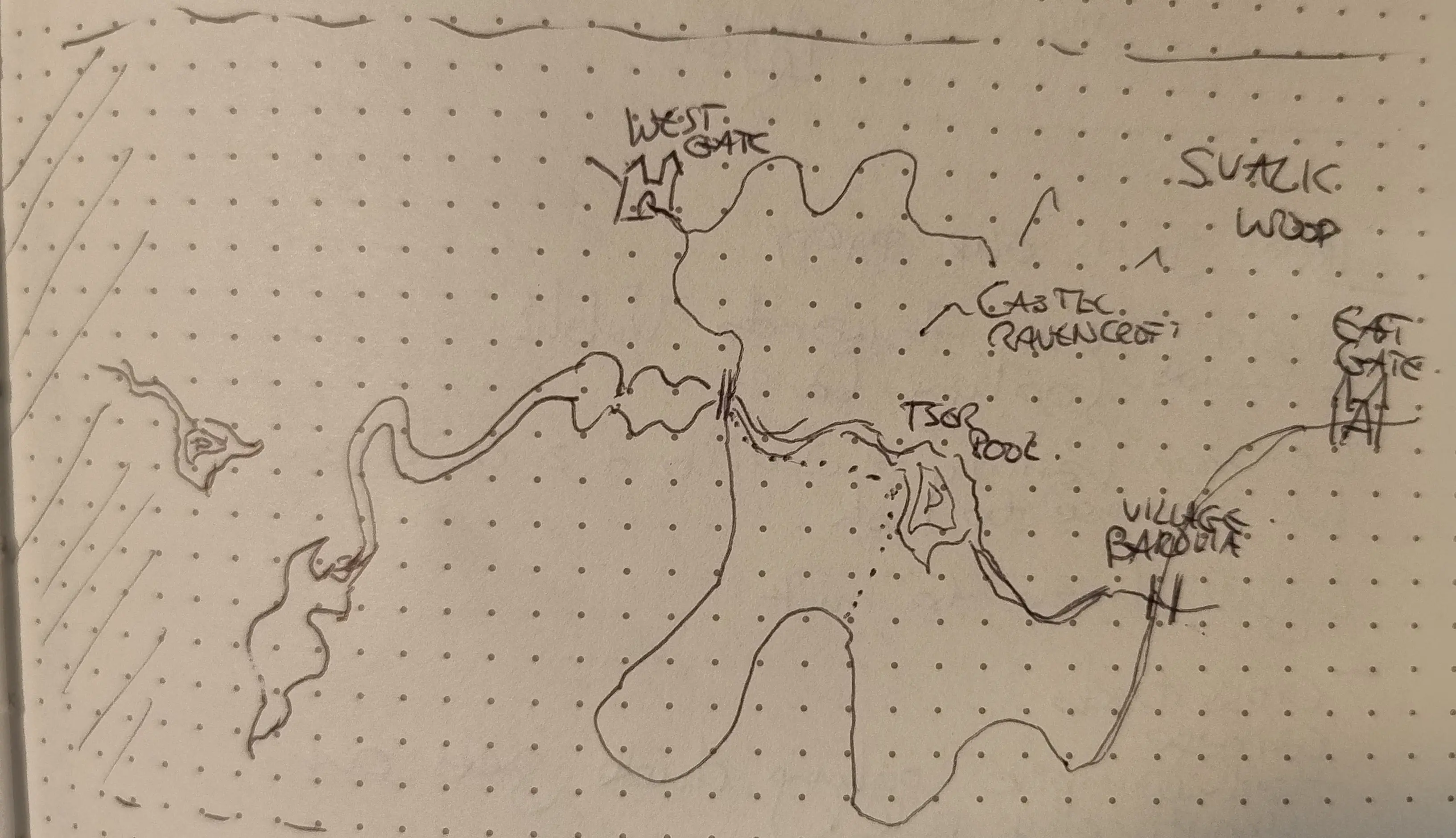 At the hummock, Ireena Kolyanovich shares a map with them which the party set about copying as well or as badly as they know how to. Below is Kora’s version. Although it looks like it should be possible to walk to the West Gate to Vallaki via Tser Pool, Ireena tells them that this is an optical illusion, and that the path from Tser Pool simply runs to Tser Falls on the west side of the bridge, running underneath the bridge instead. Hence, the only way to reach both Vallaki and Tser Pool is to return to the main road the way the party came after visiting Madam Eva.